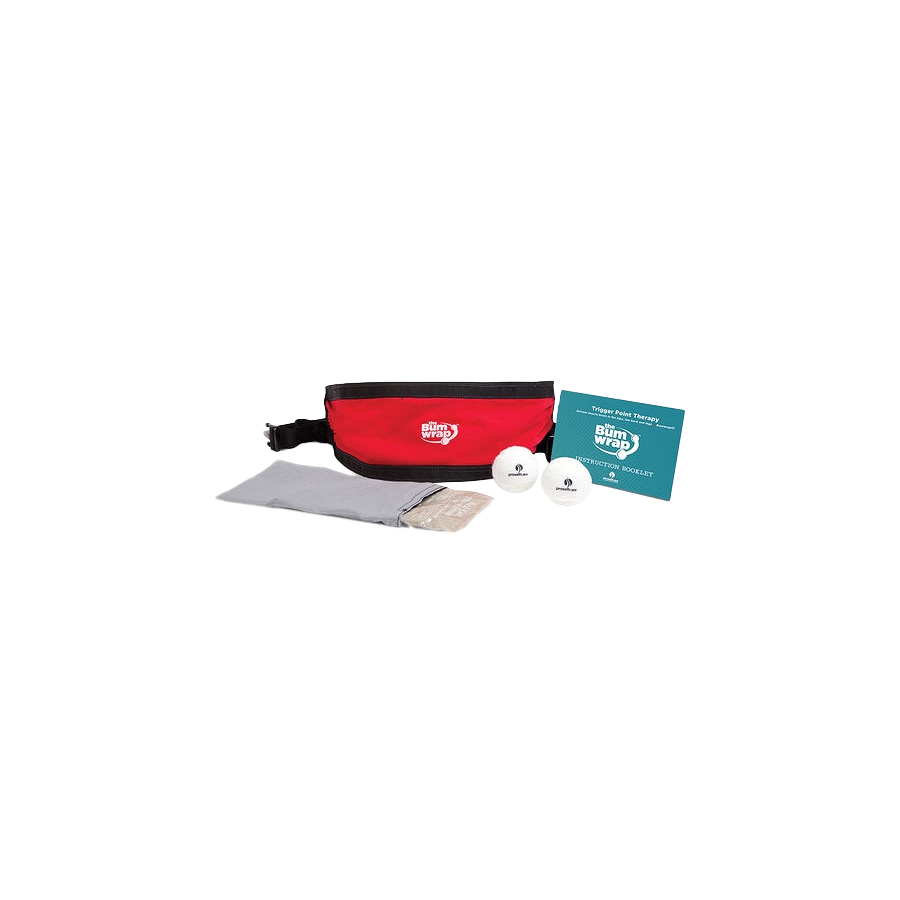 The Bum Wrap is a fanny-pack style wrap that fits around the hips. It combines a hot/cold compress with therapy balls in an adjustable wrap to target and relieve trigger point pain.